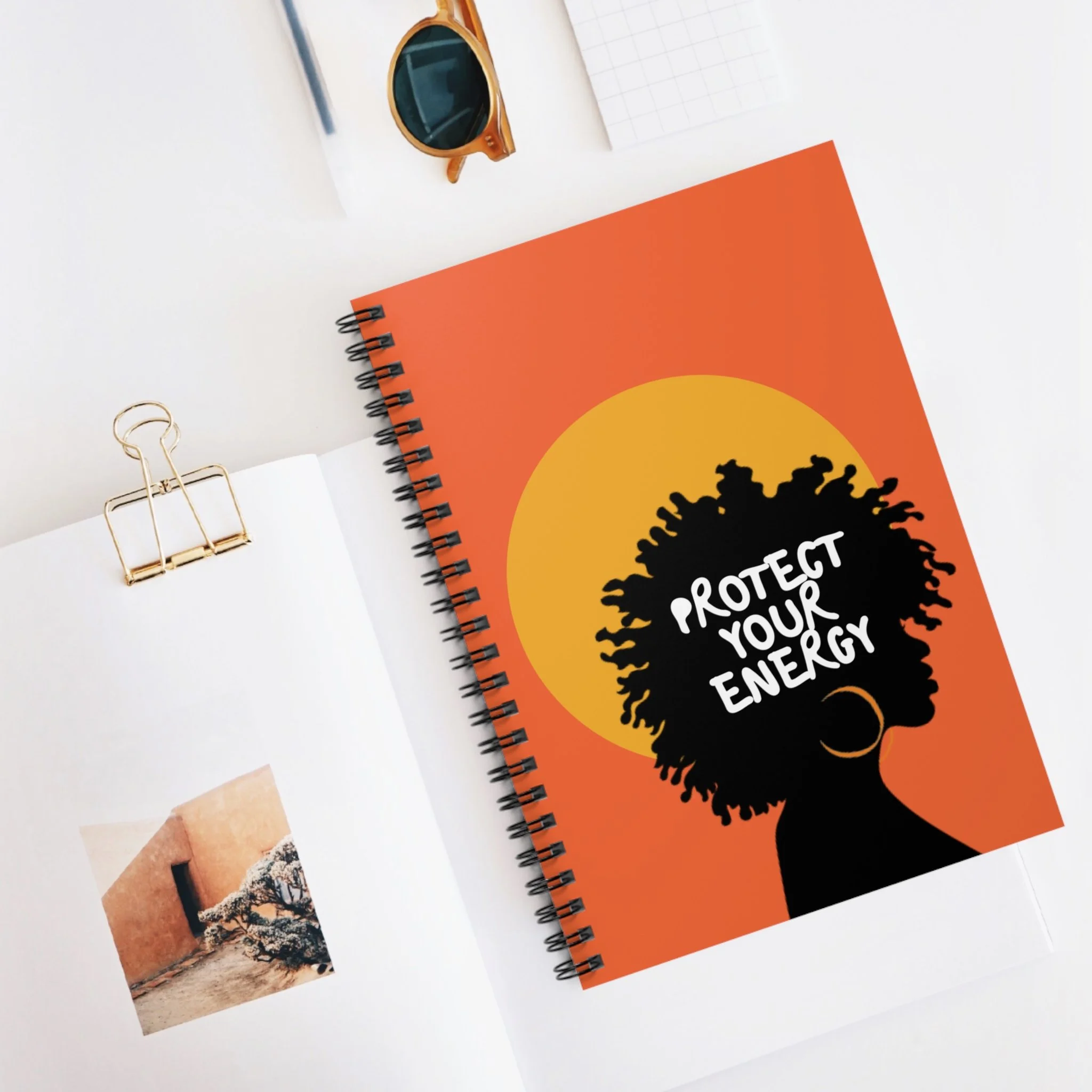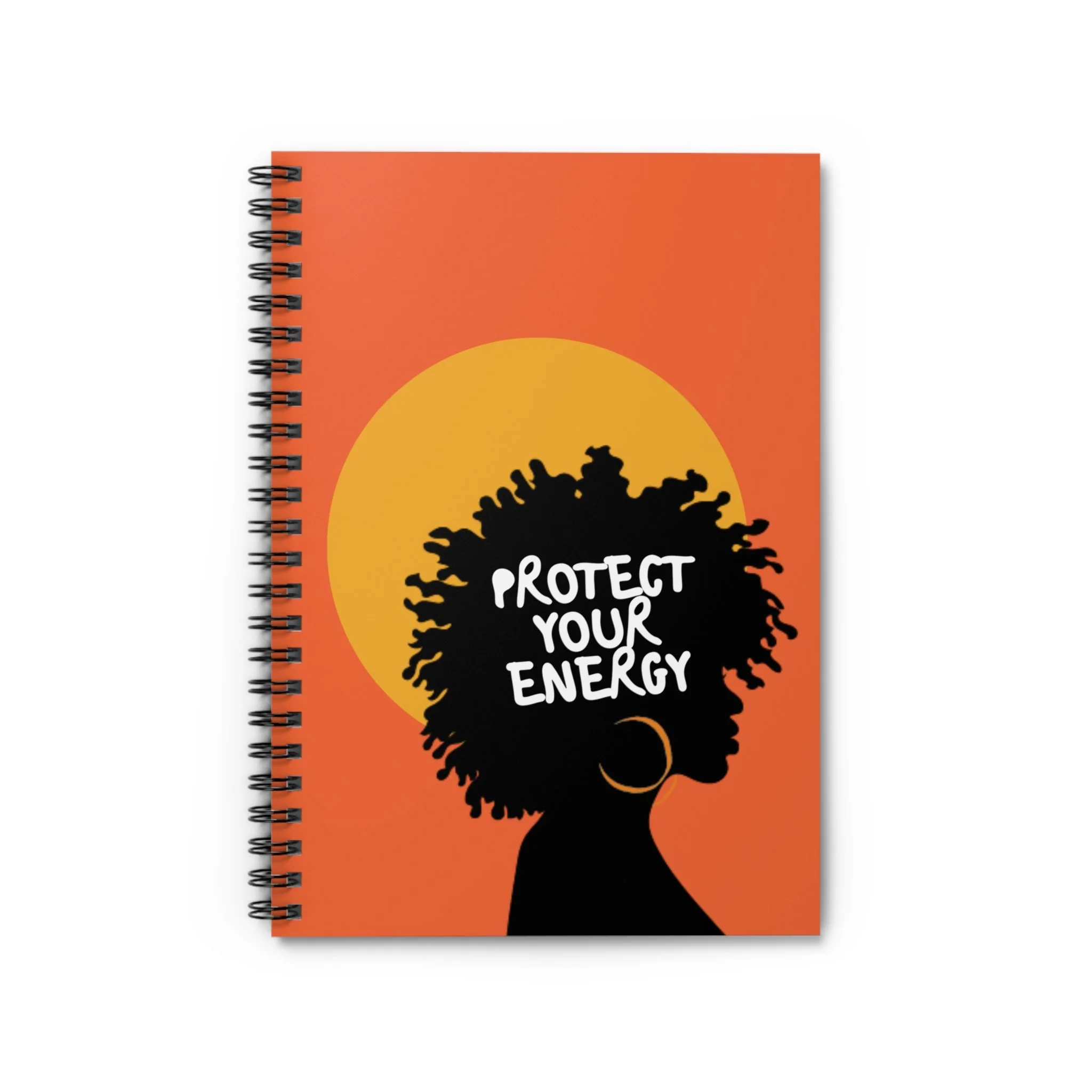 This spiral notebook holds a quiet, steady invitation to pause and protect your energy. The front cover’s empowering afro silhouette feels like a gentle, confident breath. It was created with Black women in mind, to sit beside therapy notes, morning pages, or moments of reflection. The ruled pages make it simple to track progress, jot down coping strategies, or capture affirmations. A document pocket on the inside back keeps meaningful cards, receipts, or prompts within reach. Compact and tactile, it moves easily between couch, clinic, and daily life, a small ritual object that honors healing and self-care.